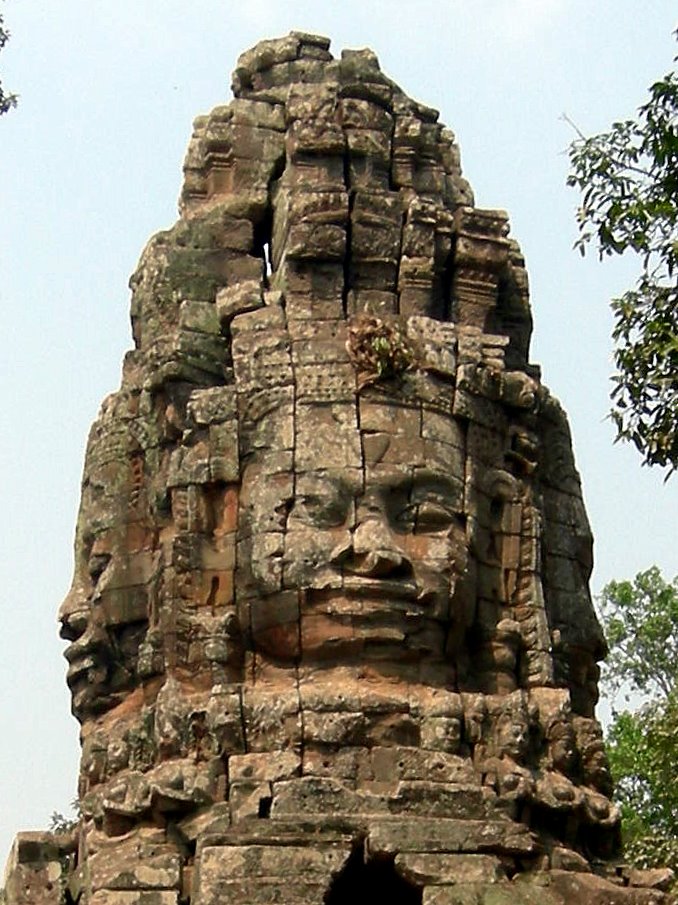 King Jayavaram VII bears a strong resemblance to the face of Avalokiteshvara, as can be seen from the portrait above which is in the Musée Guimet in Paris. Jayavarman stood squarely in the tradition of the Khmer monarchs in thinking of himself as a "devaraja" (god-king), the notable difference being that while his predecessors were Hindus and regarded themselves as consubstantial with Shiva and his symbol the lingam, Jayavarman as a Buddhist identified himself with Buddha and the bodhisattva.